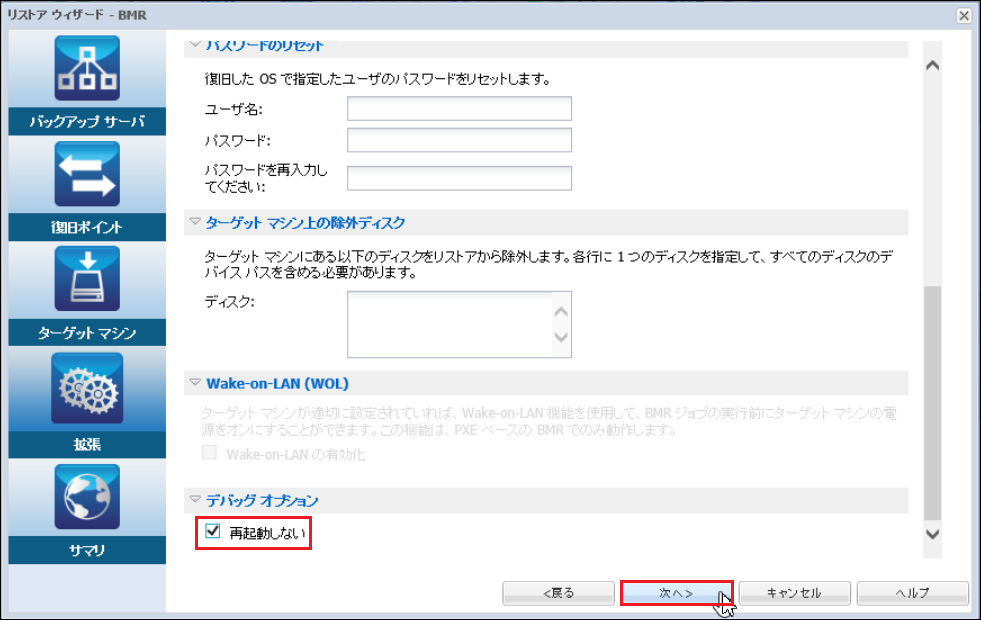 20.画面下部の「デバッグオプション」欄にて、[再起動しない]にチェックを入れます。