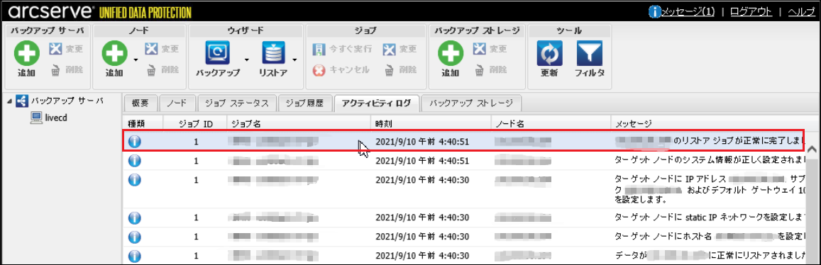 24.[アクティビティログ]タブにてリストアジョブが成功したことを確認します。