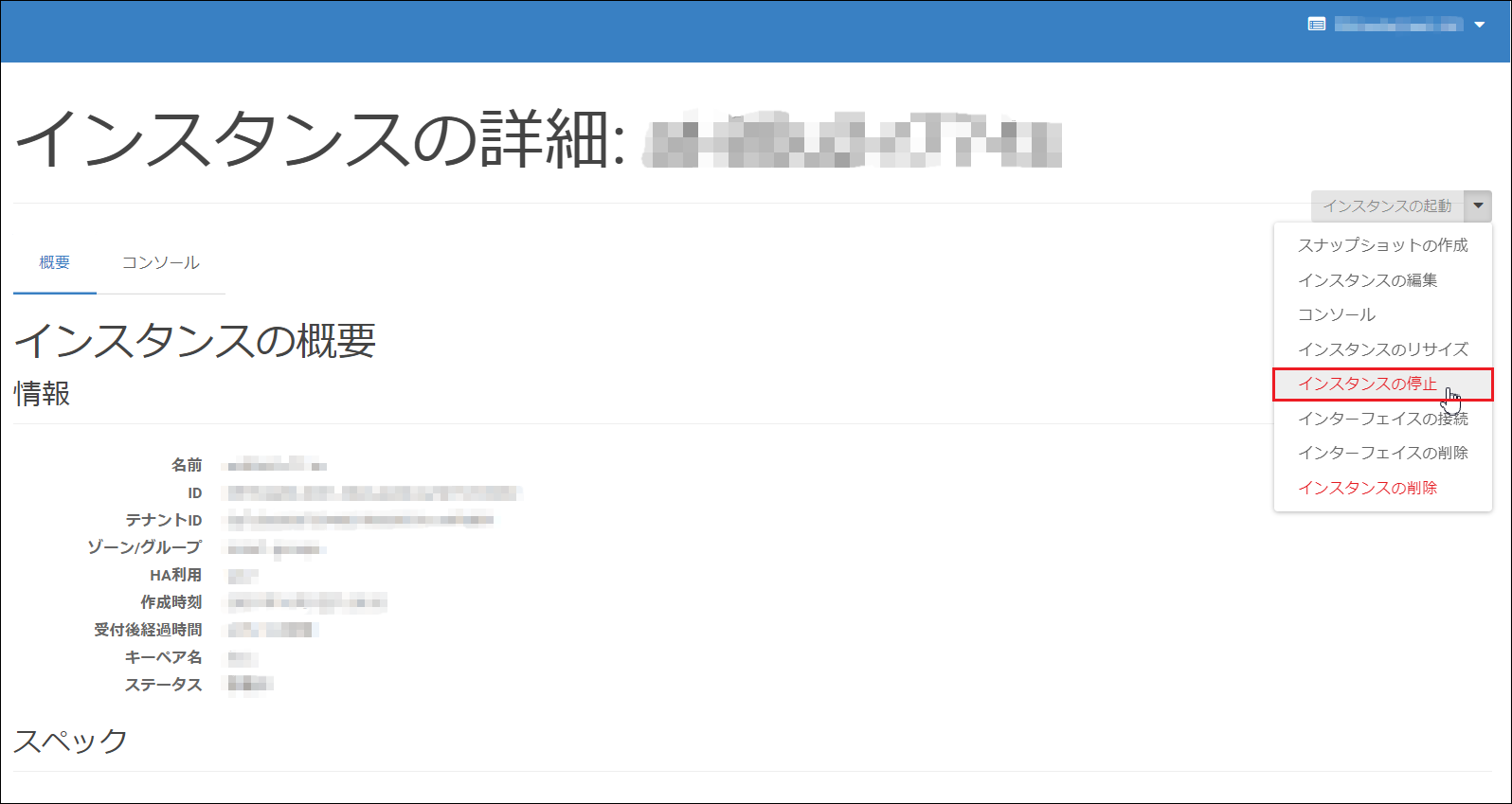 2.インスタンスの詳細画面にてインスタンス画面に入ります。