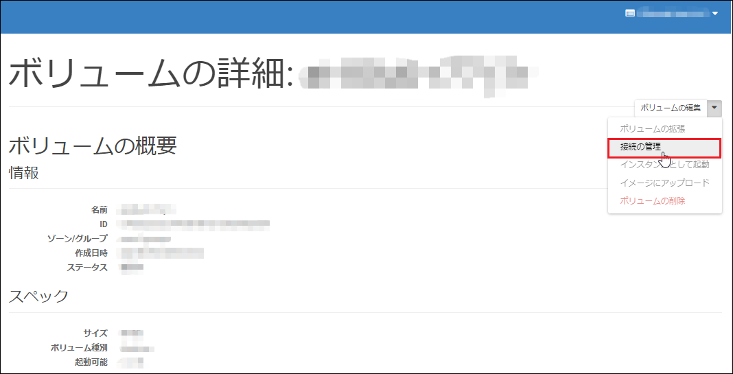 2.作成したボリューム(上記のArcserveでリストアしたボリューム)の[ボリュームの編集]欄の[▼]をクリックして、[接続の管理]を選択します。