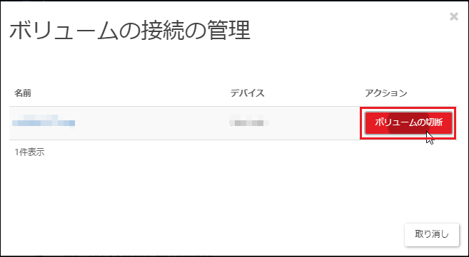 3.「ボリュームの接続の管理」画面が開くので、アクションの[ボリュームの切断]をクリックしてボリュームを切断してください。