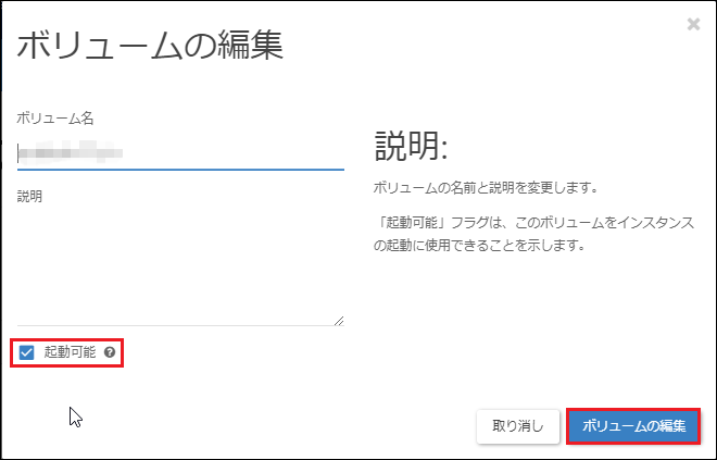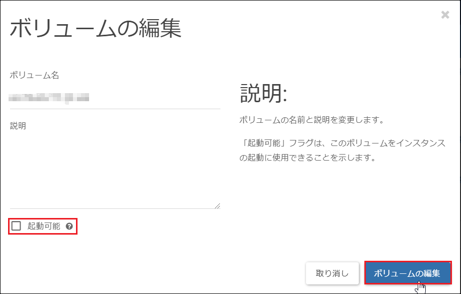 6.[起動可能]のチェックを外し、[ボリュームの編集]をクリックします。