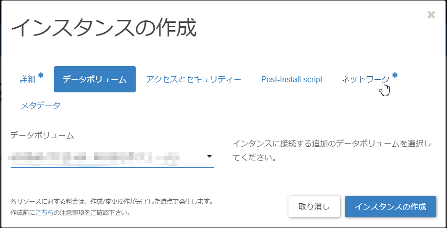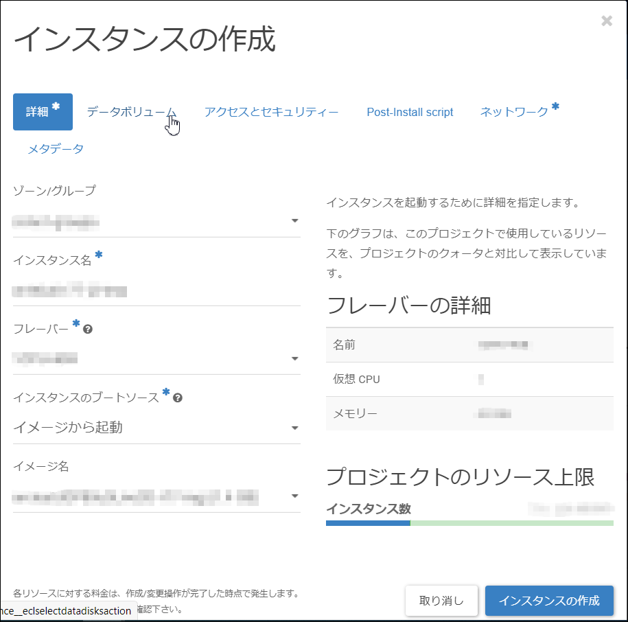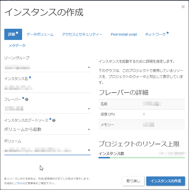 3.「インスタンスの作成」画面が表示されるので、各タブにて項目を設定します。
