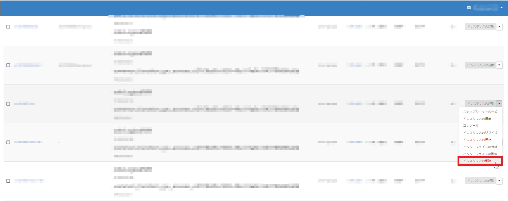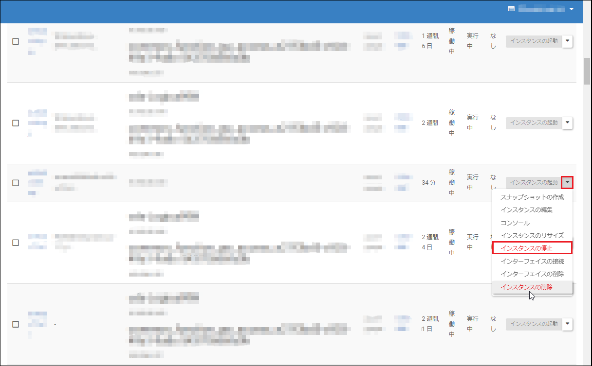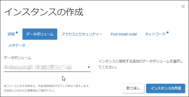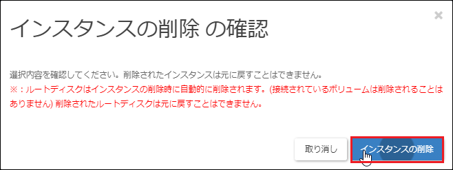 ※ここでインスタンスの削除を行わない場合は、ボリュームメニューから、ボリュームを切断してください。
