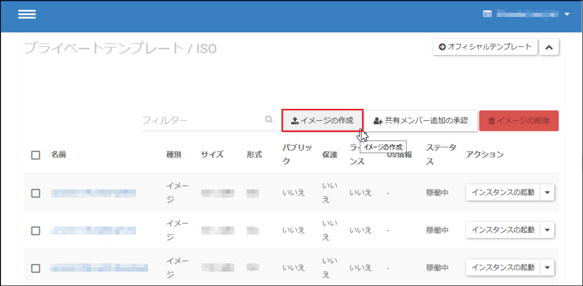 イメージをソースとして使用する:リストア元サーバーのOS種別と同等のオフィシャルテンプレート