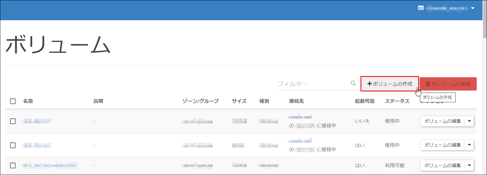 [サーバーインスタンス]—[ボリューム]—[ボリュームの作成]をクリックします。