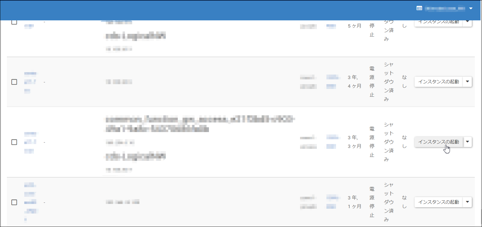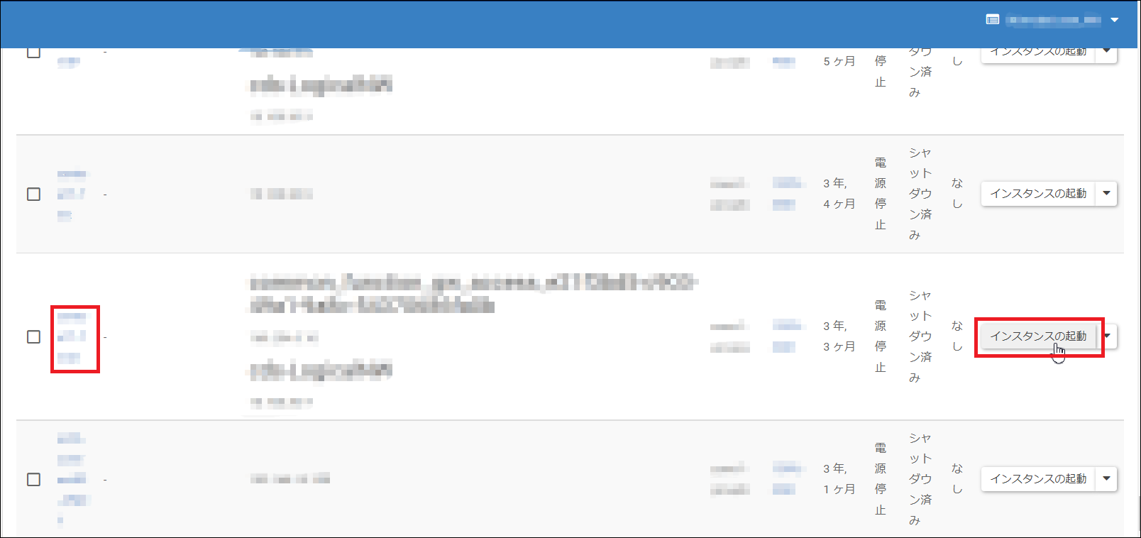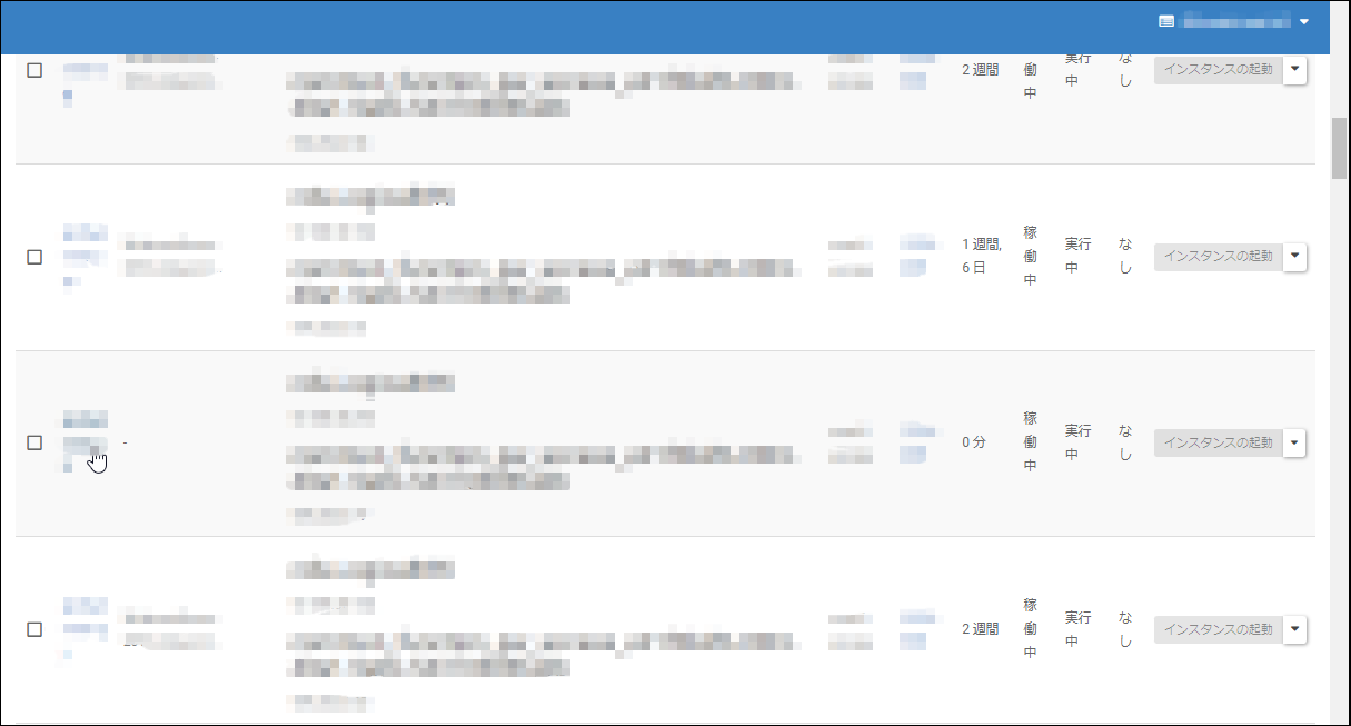 1.リストア用の一時インスタンスを起動し、インスタンス名の項目をクリックして「インスタンス」画面を表示します。