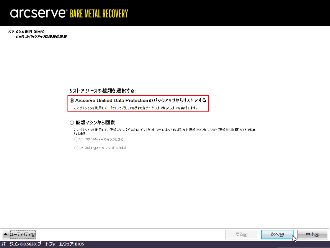 4.「リストアソースの種類を選択する」画面にて、[Arcserve Unified Data Protection のバックアップからリストアする]が選択されていることを確認し、[次へ]をクリックします。