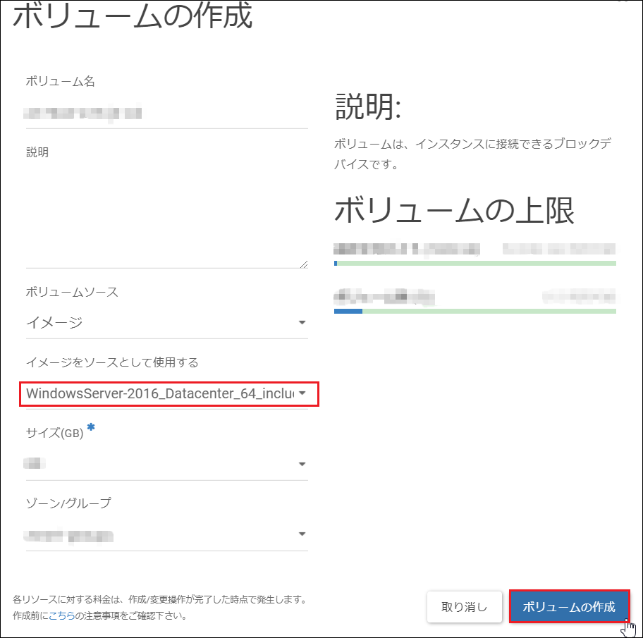 3.以下を入力/選択し、[ボリュームの作成]をクリックします。