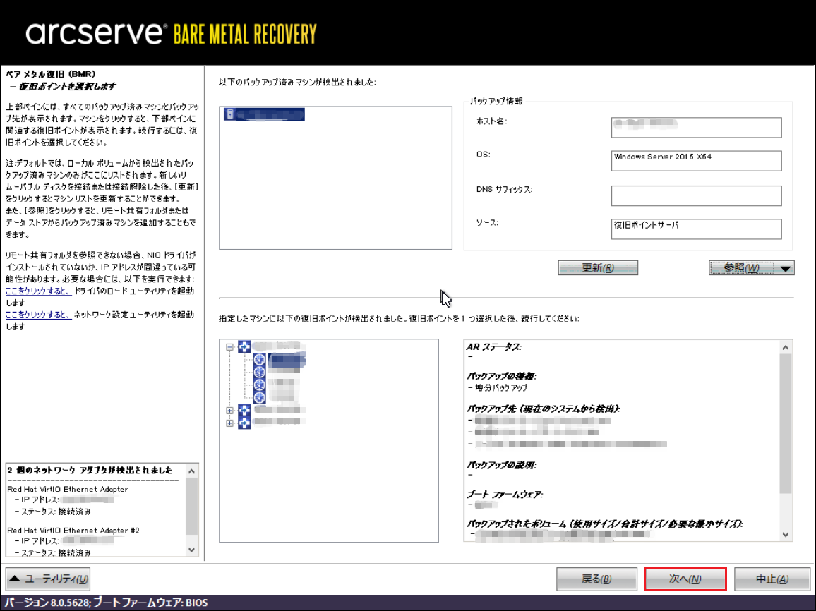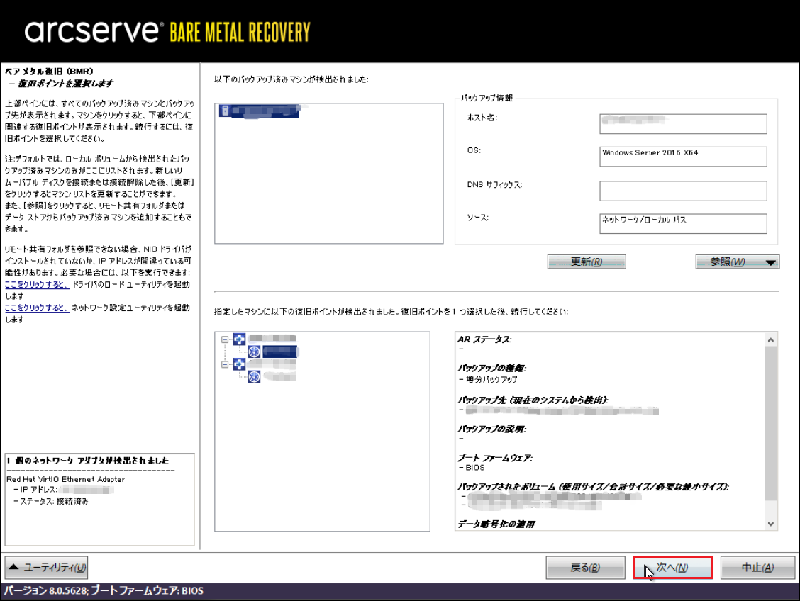 11.下記のような画面にバックアップファイル情報が表示されます。[次へ]をクリックします。