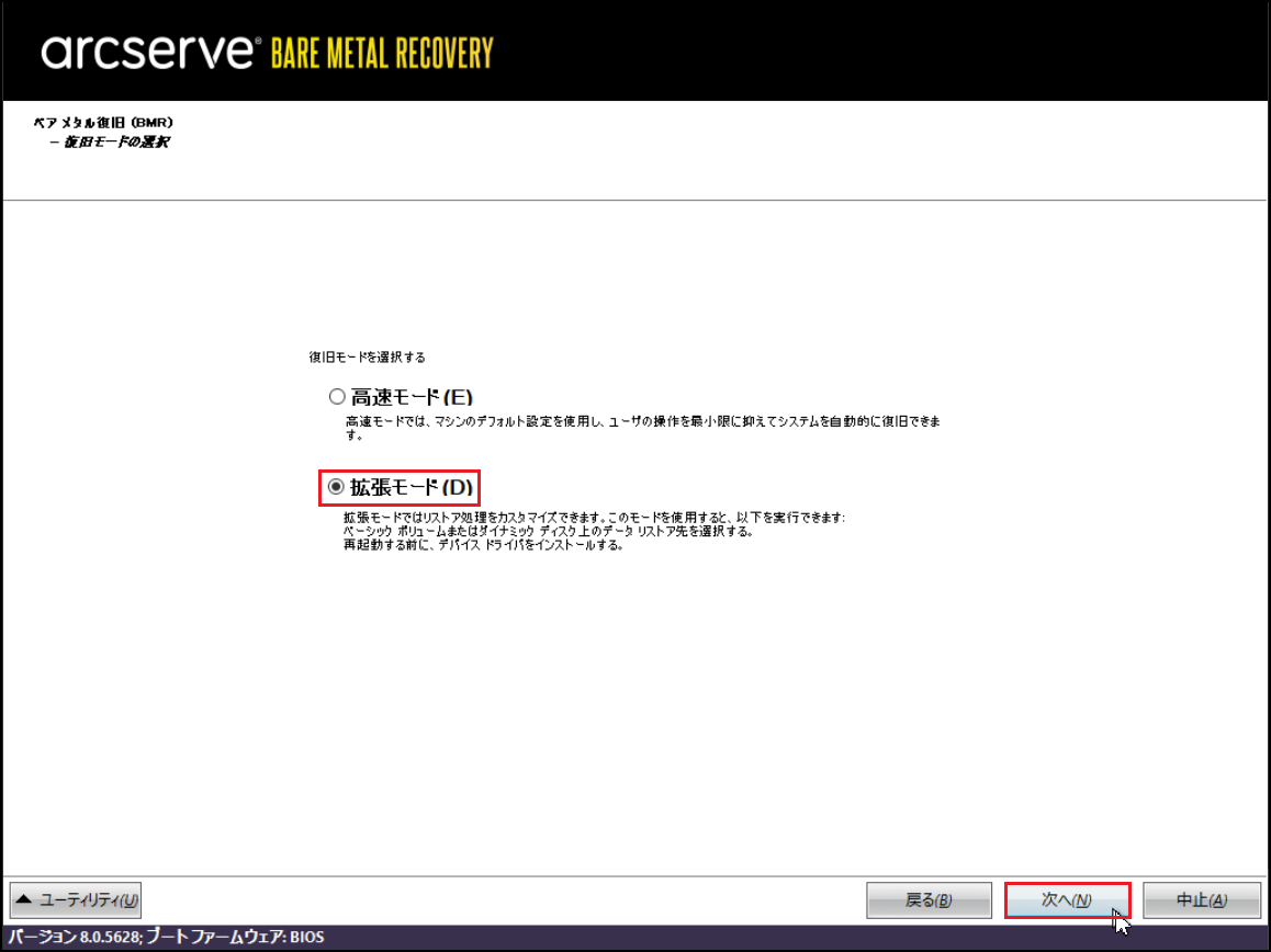 16.下記画面に戻るので[拡張モード]を選択し、[次へ]をクリックします。