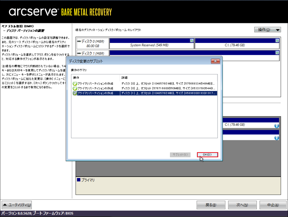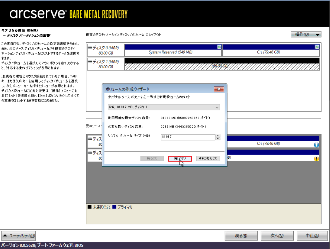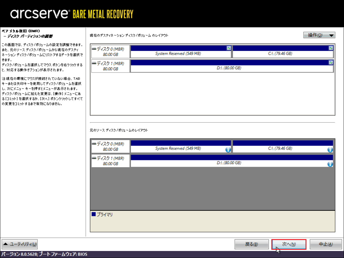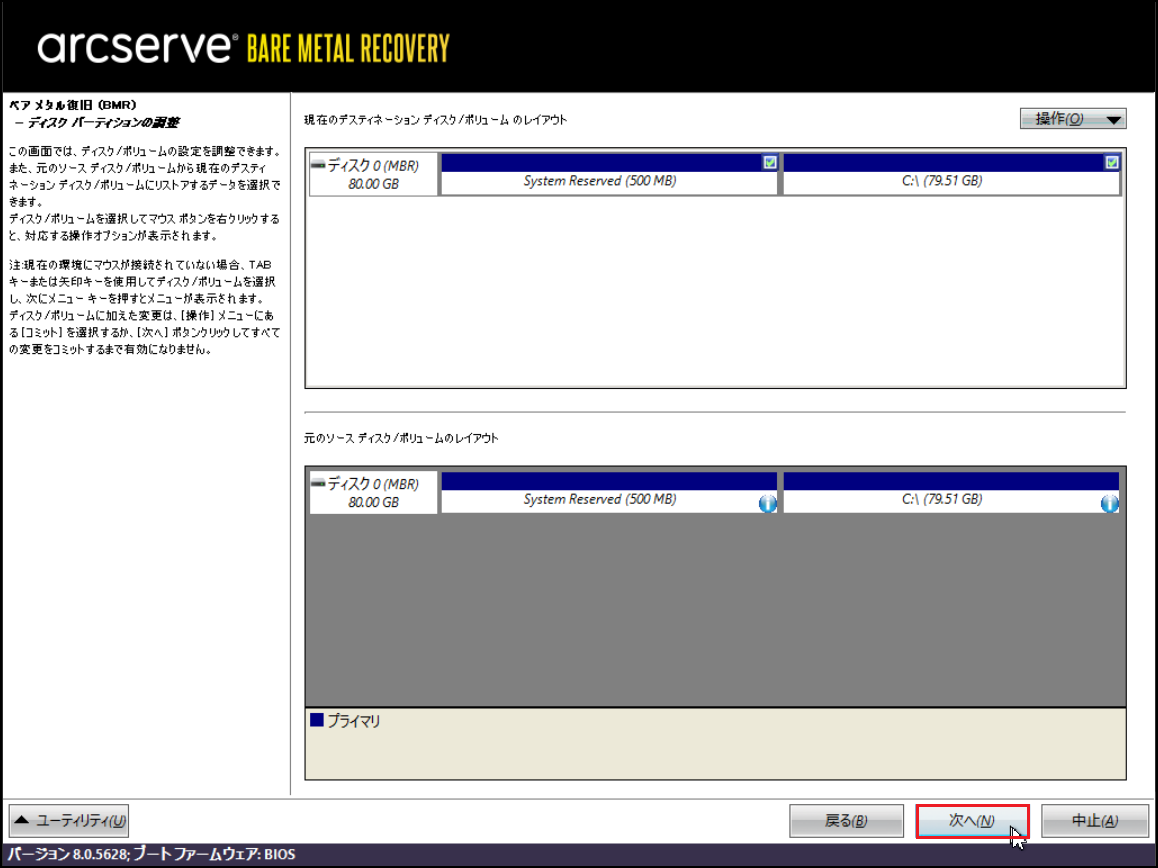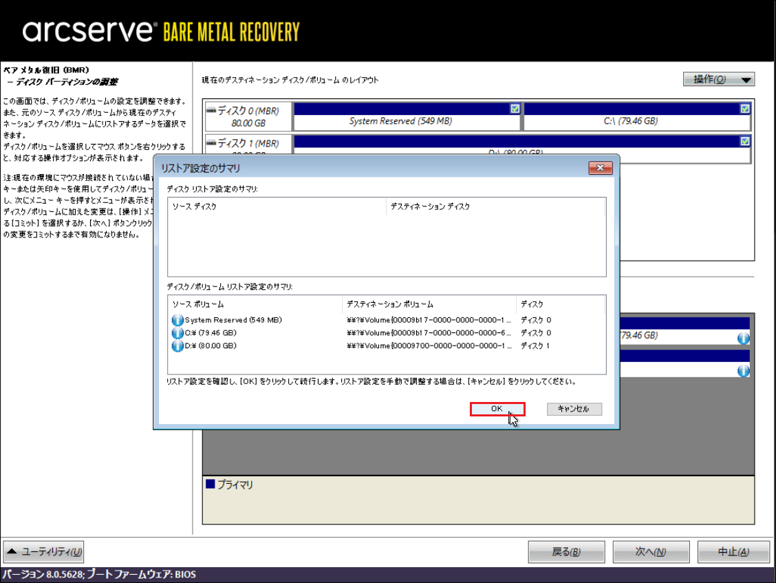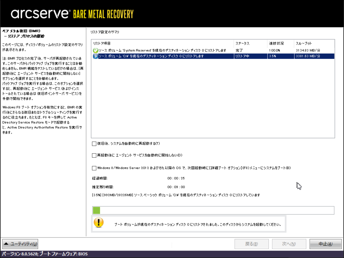 ※ここからArcserveの機能でバックアップファイルから上記の空ボリュームにデータをリストアします。