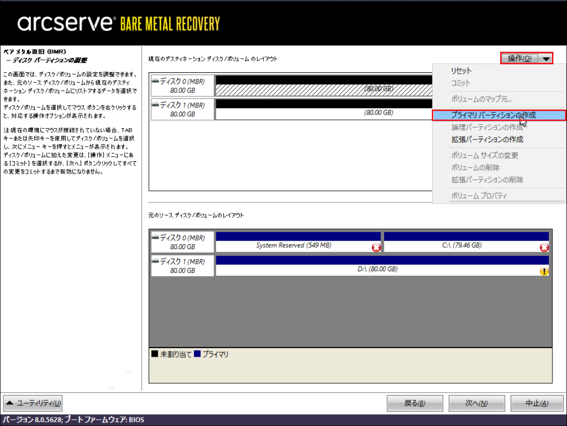 20.その場合は、上段のリストア先ディスク/ボリュームで設定するボリュームを選択した後、[操作]から[プライマリパーティションの作成]を選択して、バックアップデータをすべて設定してください。