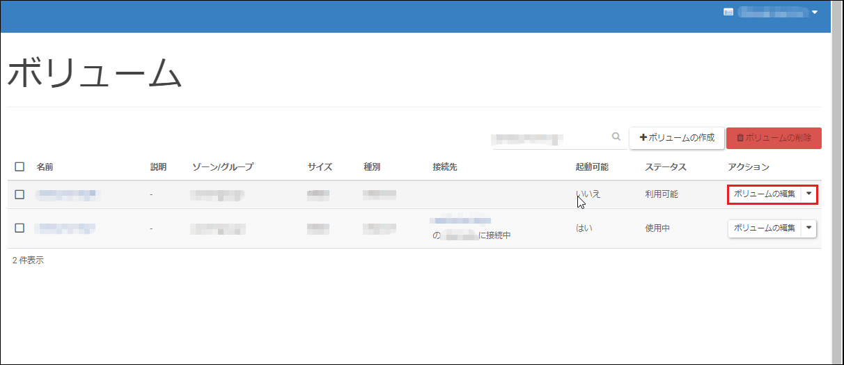 [ボリュームの接続]画面が開くので、アクションの[ボリュームの切断]をクリックしてボリュームを切断してください。