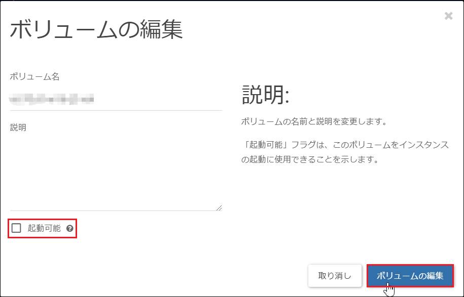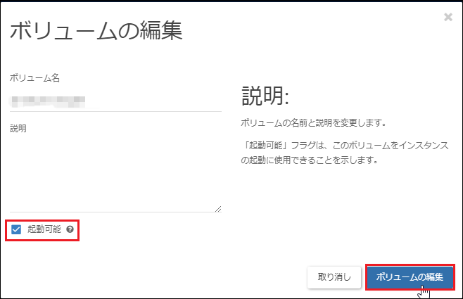 6.[起動可能]のチェックを外し、[ボリュームの編集]をクリックします。