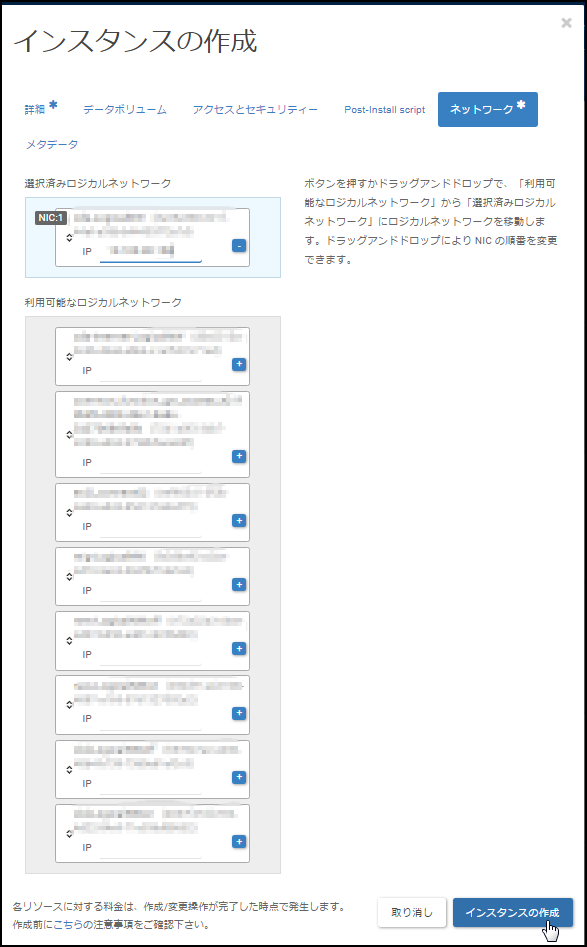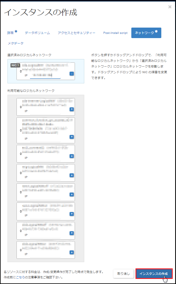 5.利用可能なロジカルネットワークからこのインスタンスに設定するIPアドレスを選択し、選択済みロジカルネットワークにIPアドレスを設定します。