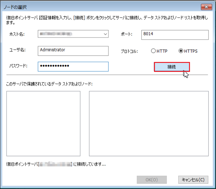 13.復旧ポイントサーバーの「ホスト名」、「ユーザ名」、「パスワード」を入力し、「プロトコル」を[HTTPS]に変更します。その後[接続]をクリックします。