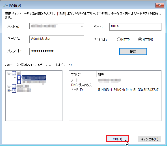 14.「データストア」を選択すると「ノード」が表示されるので、リストアする[ノード]を選択し、[OK]をクリックします。