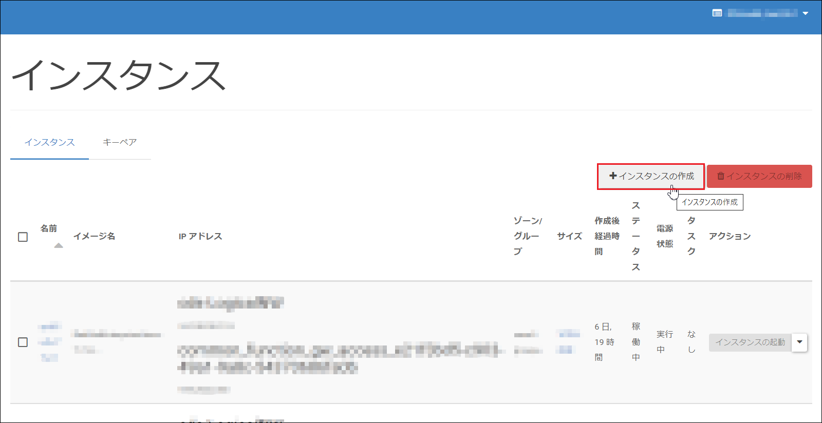 6.次に新規にインスタンス(リストアサーバー)を作成します。[インスタンスの作成]をクリックします。