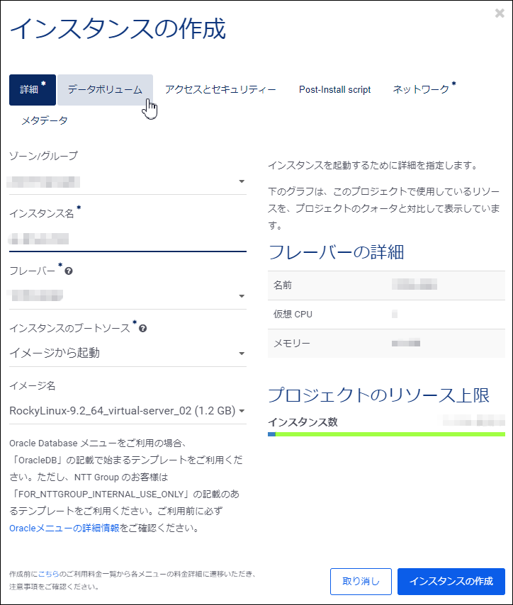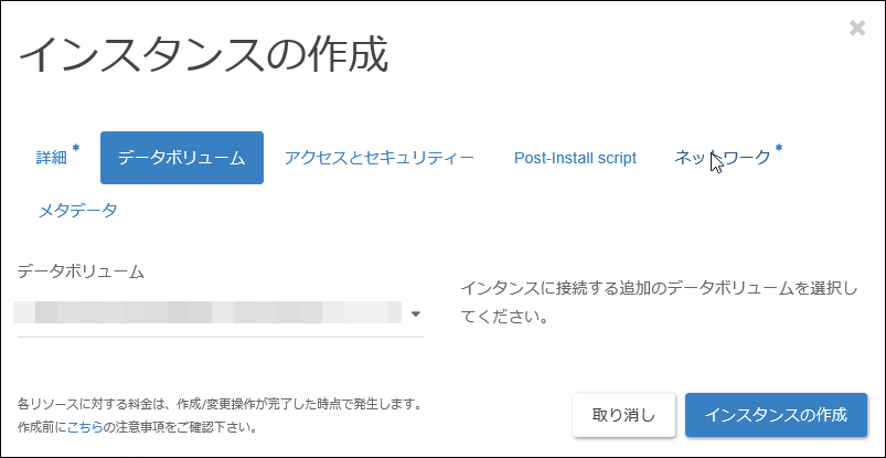 2.「インスタンスの作成」画面が表示されるので、各タブにて項目を設定します。