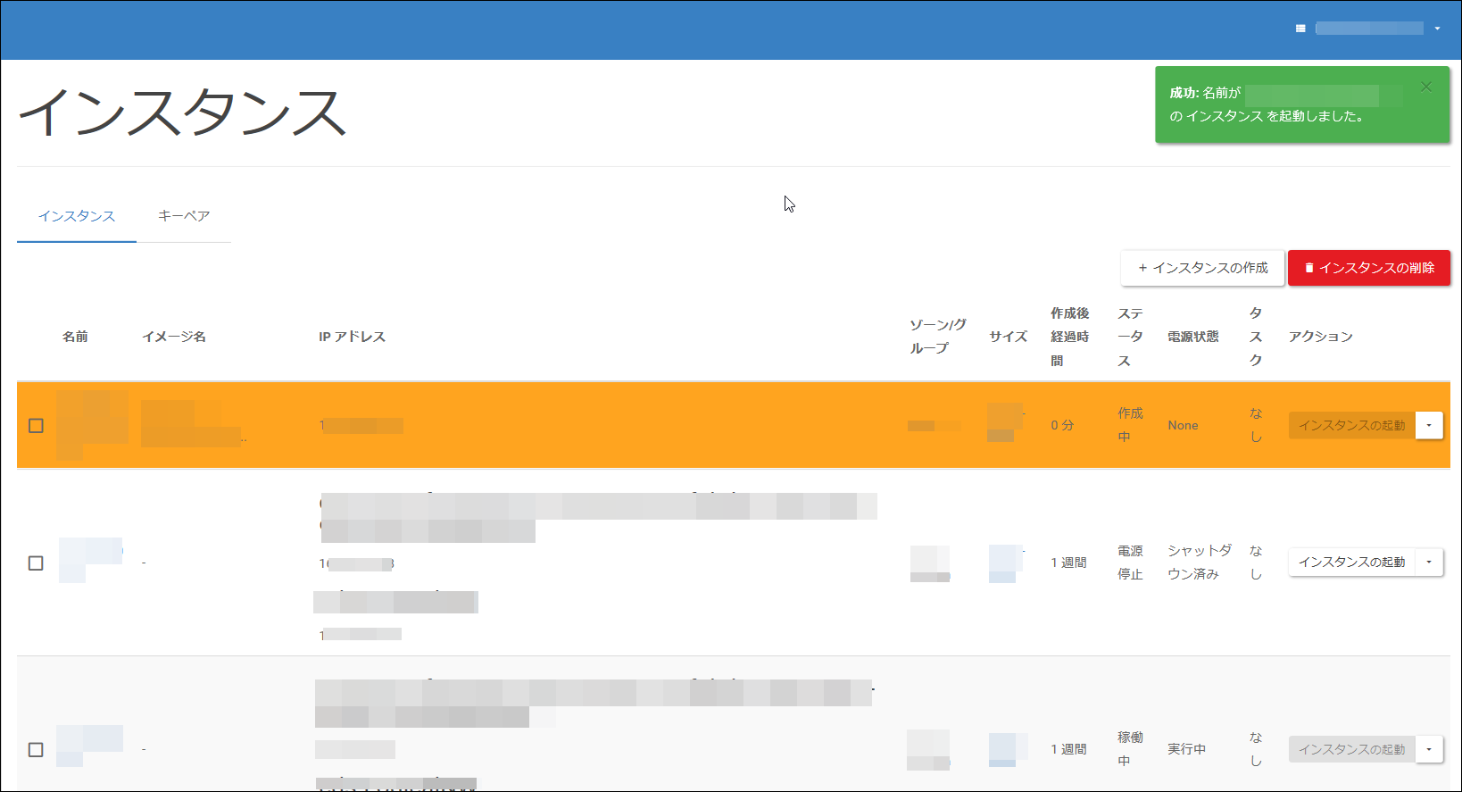 上記を設定後、[インスタンスの作成]をクリックします。