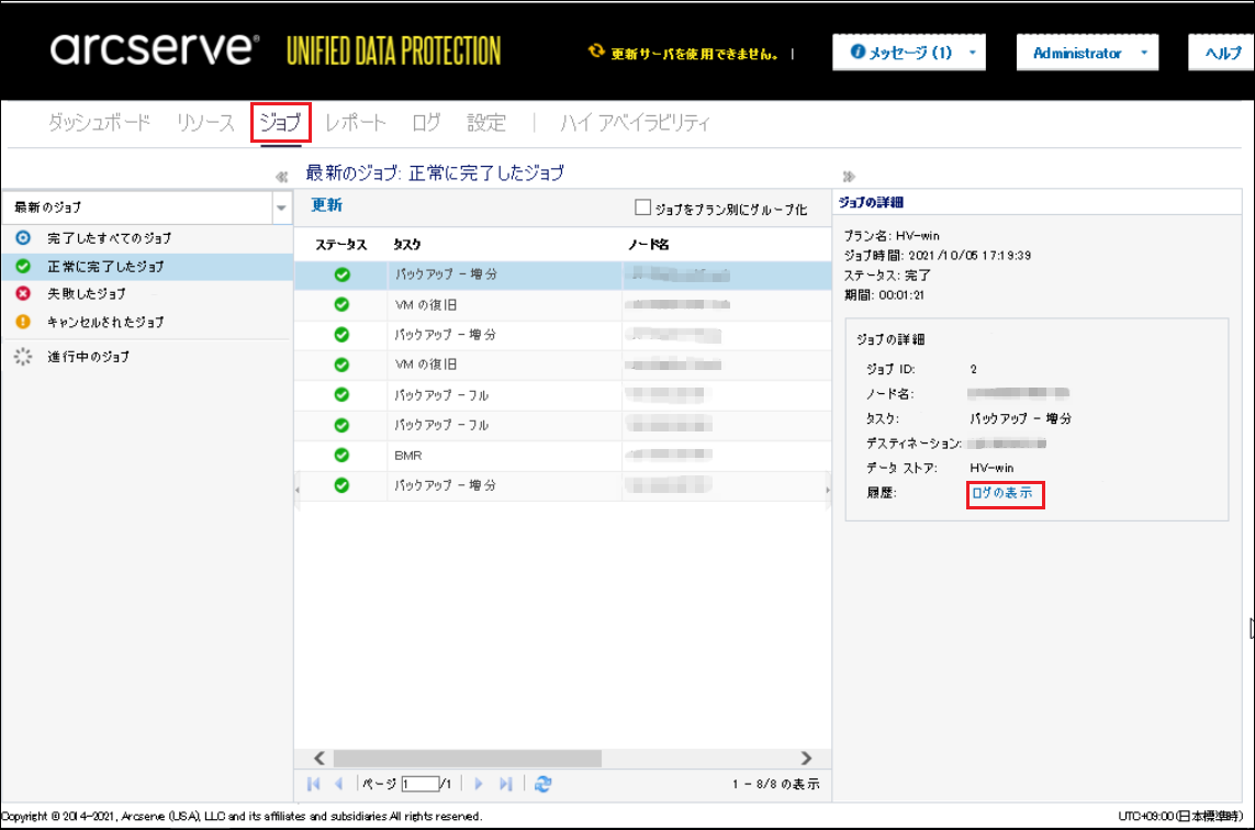 1.[ジョブ]タブから、特定ノードの最新のジョブに対してログを表示できます。