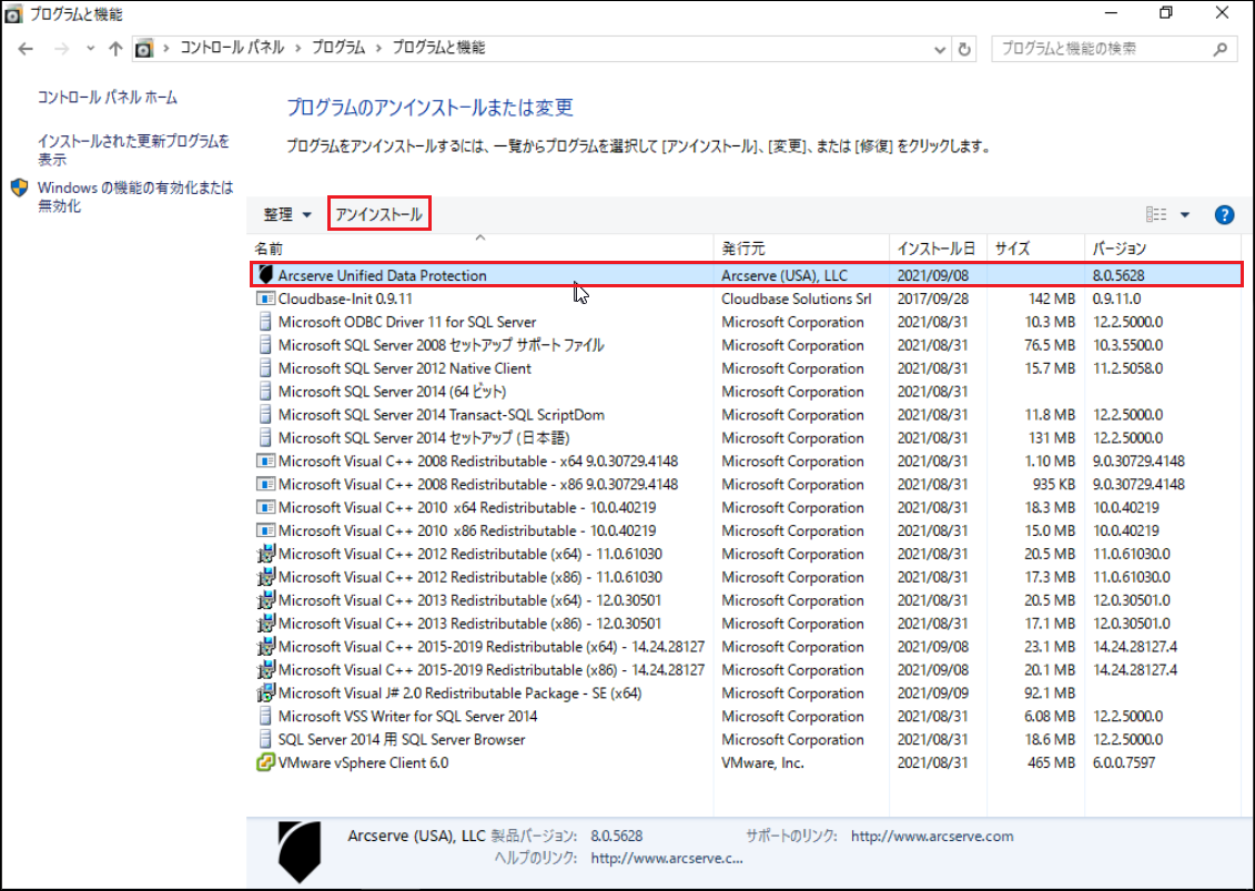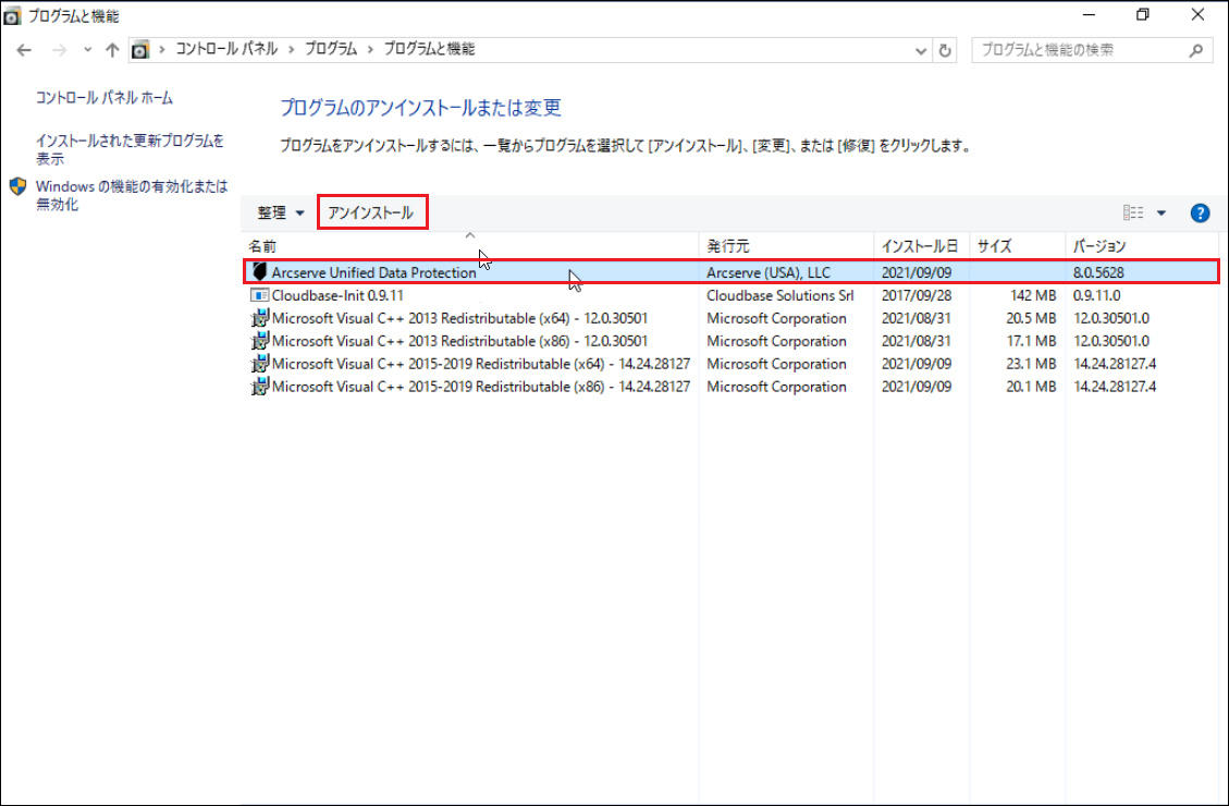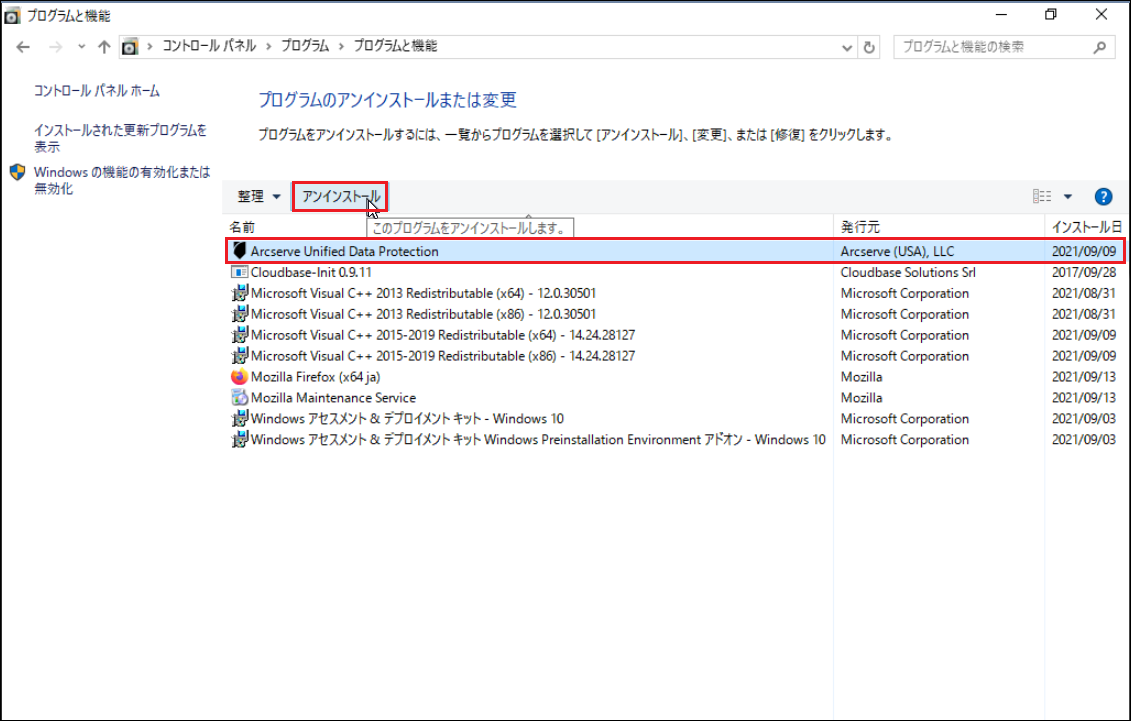 2.「プログラムと機能」の中から、「Arcserve Unified Data Protection」を選択し、[アンインストール]をクリックします。