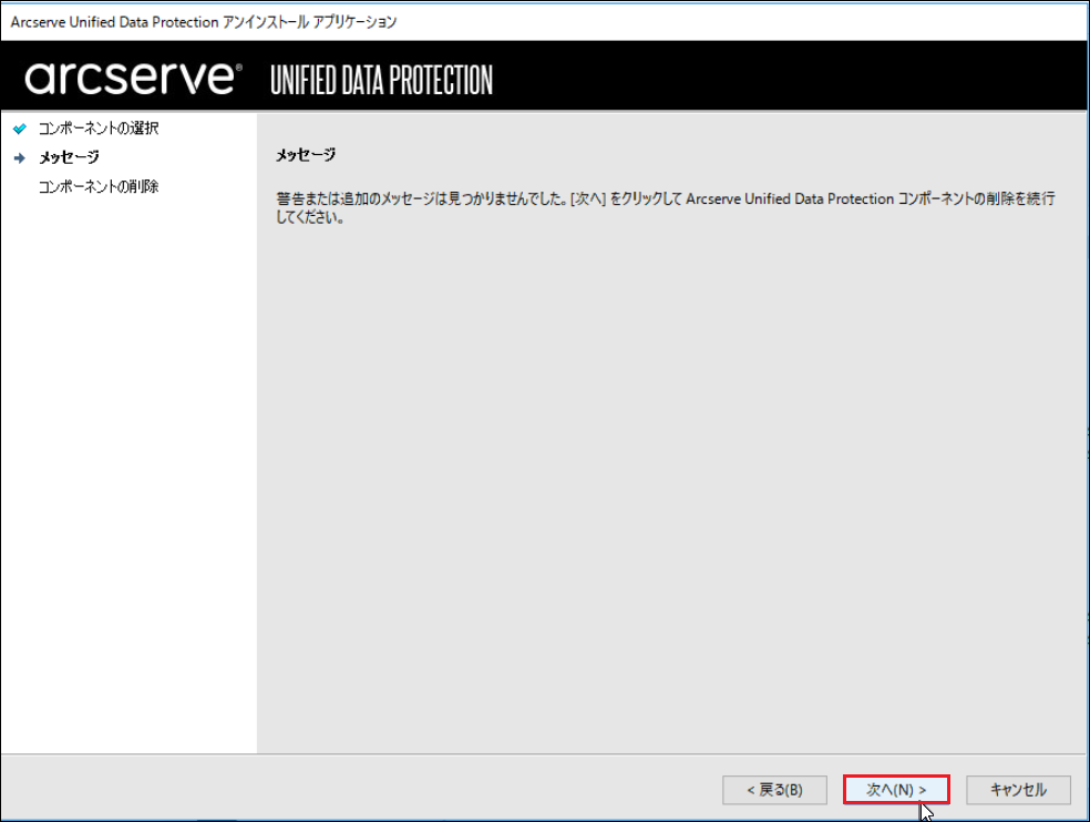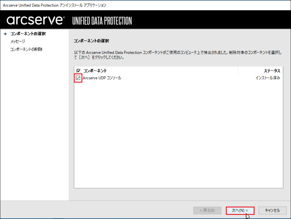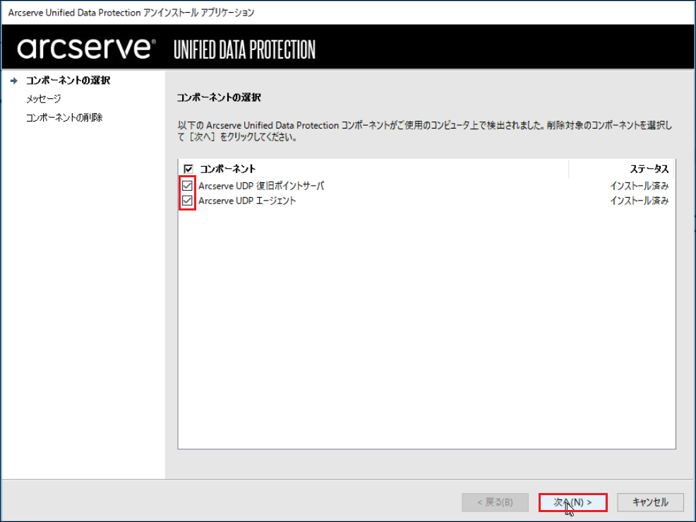 3.Arcserve Unified Data Protection アンインストール アプリケーションが起動します。削除するコンポーネントにチェックを入れ、[次へ]をクリックします。