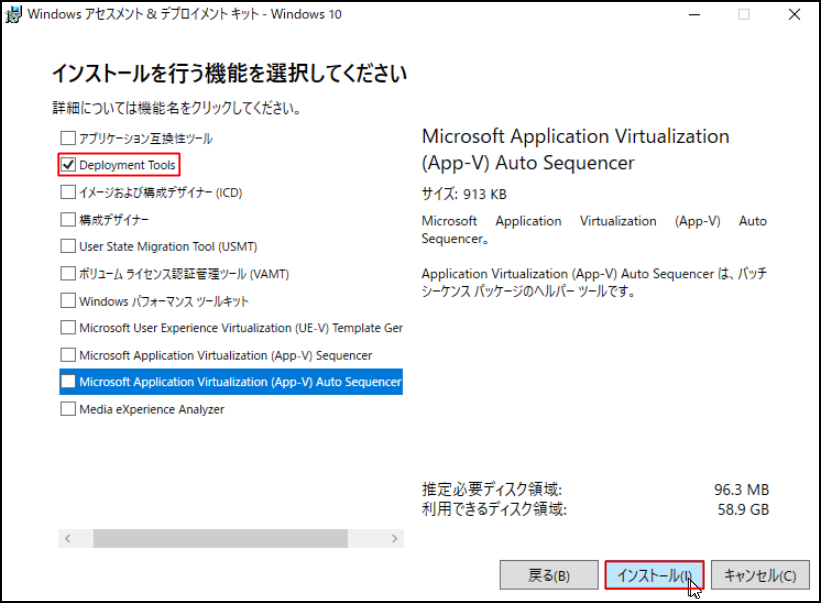 9.「インストールを行う機能を選択してください」画面にて、[Deployment Tools]を選択し、[インストール]をクリックします。