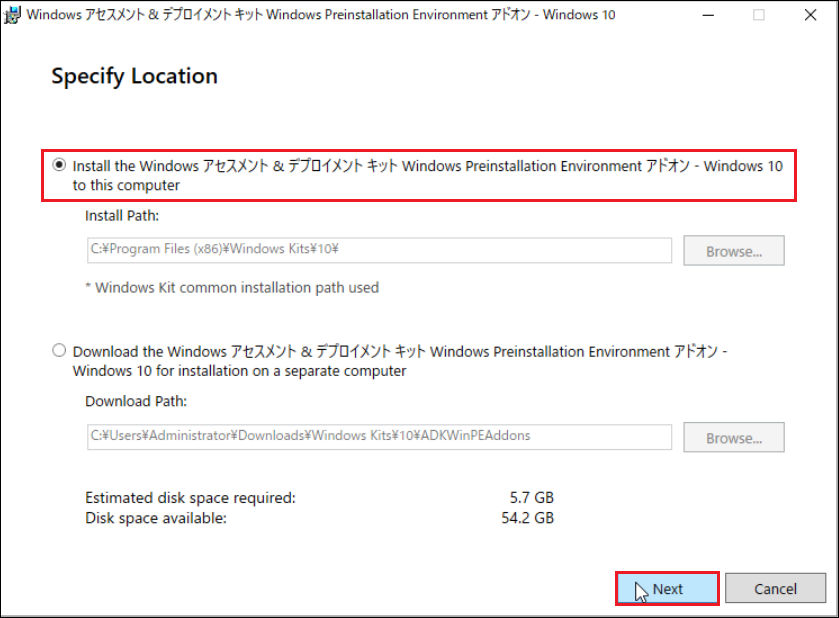 12.[Install the Windows アセスメント & デプロイメントキット Windows Preinstallation Environment アドオン - Windows 10 to this computer]を選択し、[Next]をクリックします。
