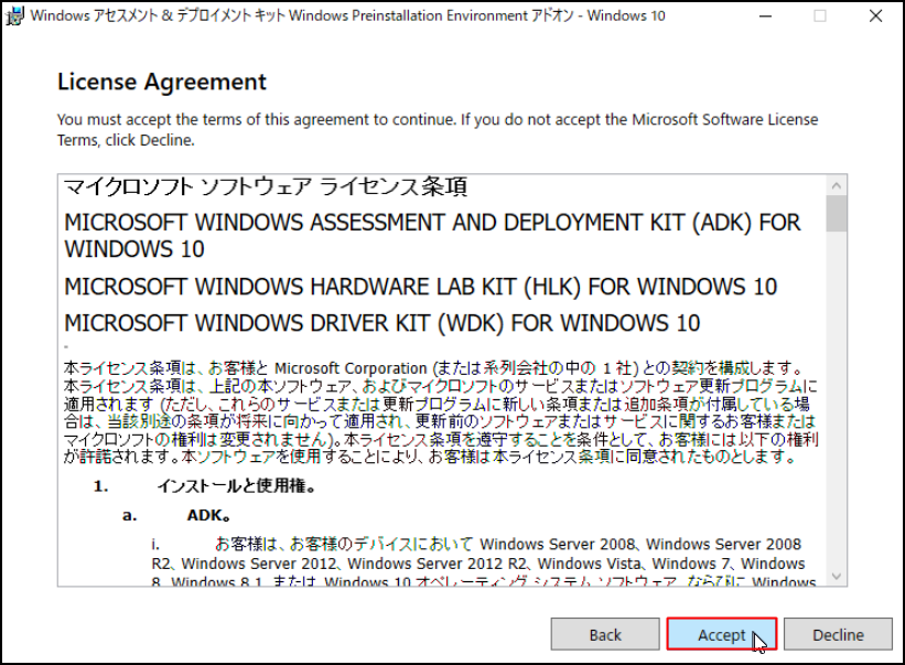 14.「License Agreement」画面にて、ライセンス条項を確認し、同意する場合は[Accept]をクリックします。