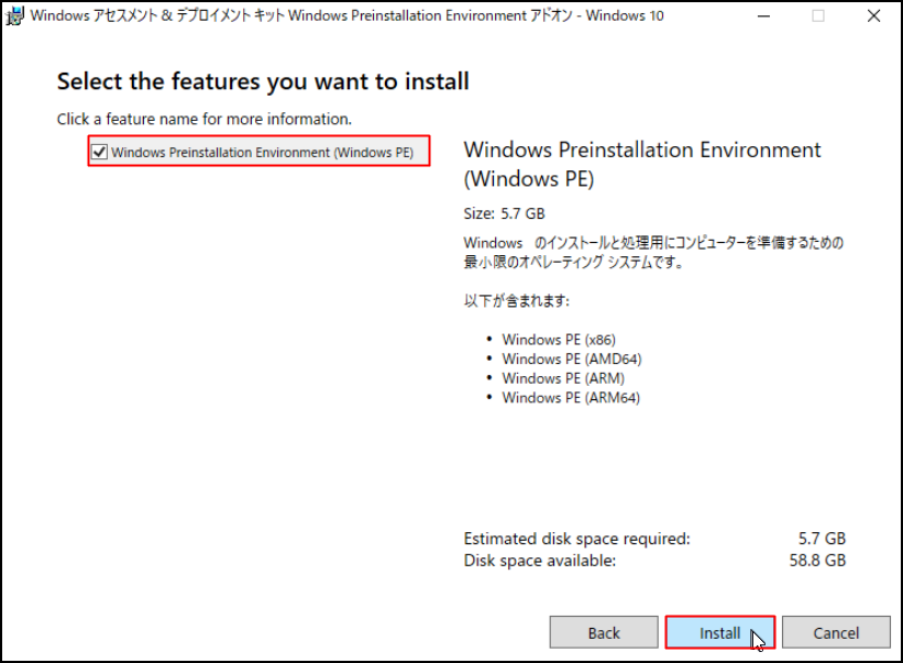 15.「Select the features you want to install」画面にて、[Windows Preinstallation Environment (Windows PE)]を選択し、[Install]をクリックします。
