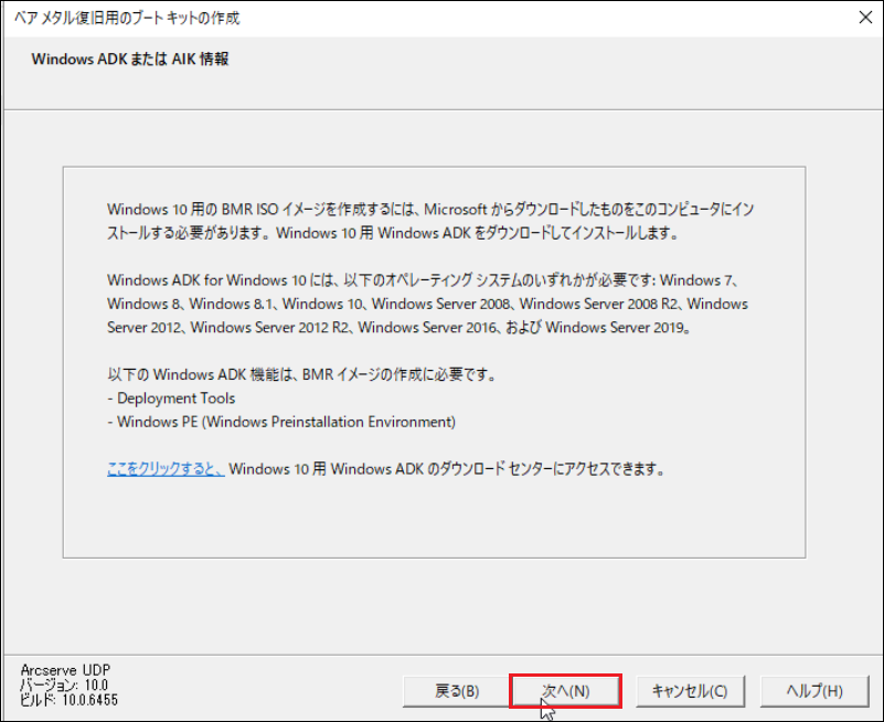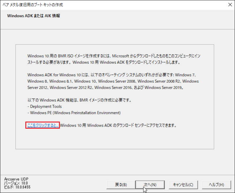 Windows ADK(Windows アセスメント & デプロイメント キット)または Windows AIK(Windows 自動インストール キット)がインストールされていない場合は、「Windows ADK または AIK 情報」画面が表示されます。