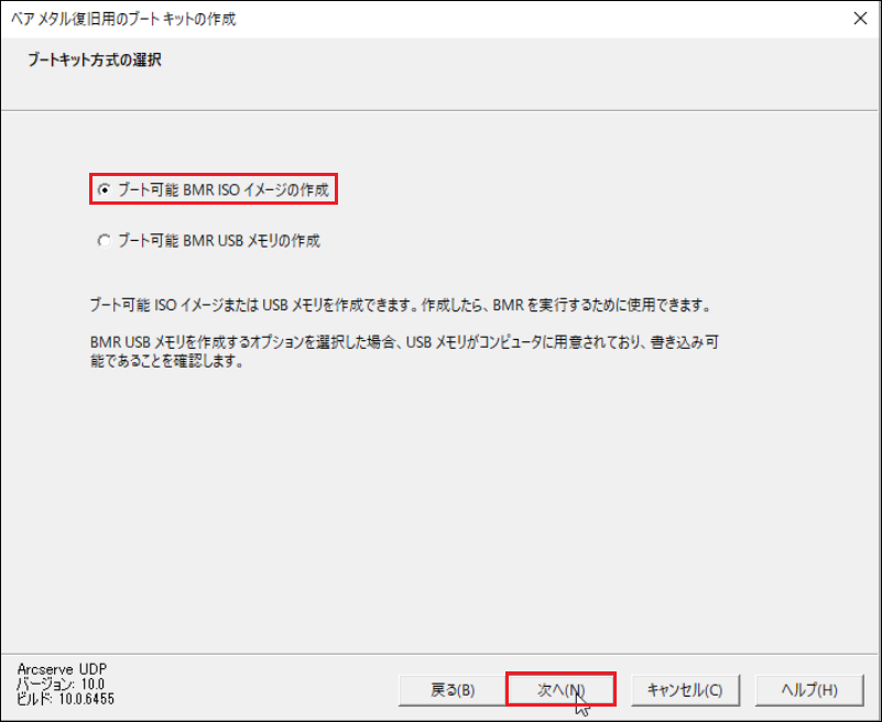 18.「ブートキット方式の選択」画面にて、[ブート可能 BMR ISOイメージの作成]を選択し、[次へ]をクリックします。