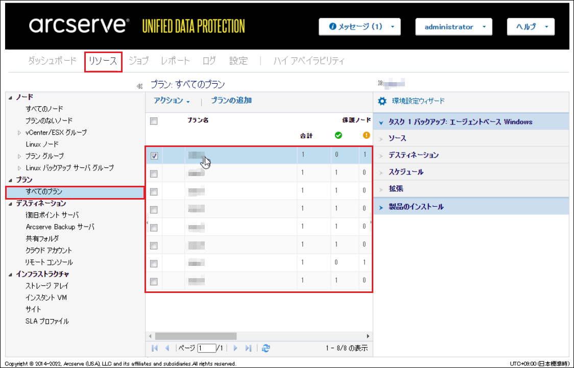 2.Arcserve UDPコンソール画面が開いたら、[リソース]—[プラン]—[すべてのプラン]をクリックし、アップグレード前のバックアップスケジュールが設定されていることを確認します。