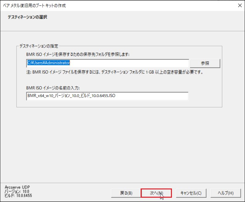 19.「デスティネーションの選択」画面の「デスティネーションの指定」にて、「BMR ISOイメージを保存するための保存先フォルダーを参照します」および「BMR ISO イメージの名前の入力」をそれぞれ指定し、[次へ]をクリックします。
