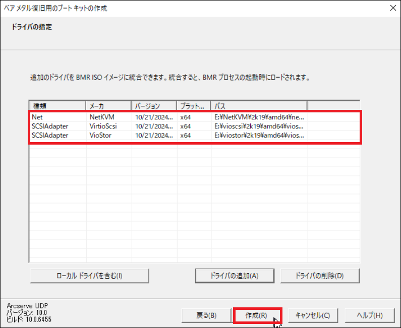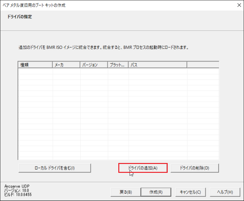 ※ドライバーを組み込んだ BMR ISO イメージを作成する場合は、[ドライバーの追加]を選択し、ドライバーを導入します。