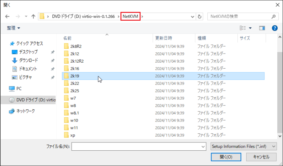 (下記画像では、例としてWindows Server 2019を使用しているため、「2k19」フォルダー内にある「netkvm.inf」を選択します)