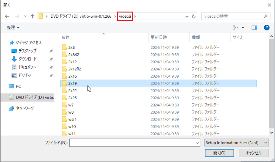 (下記画像では、例としてWindows Server 2019を使用しているため、「2k19」フォルダー内にある「vioscsi.inf」を選択します)