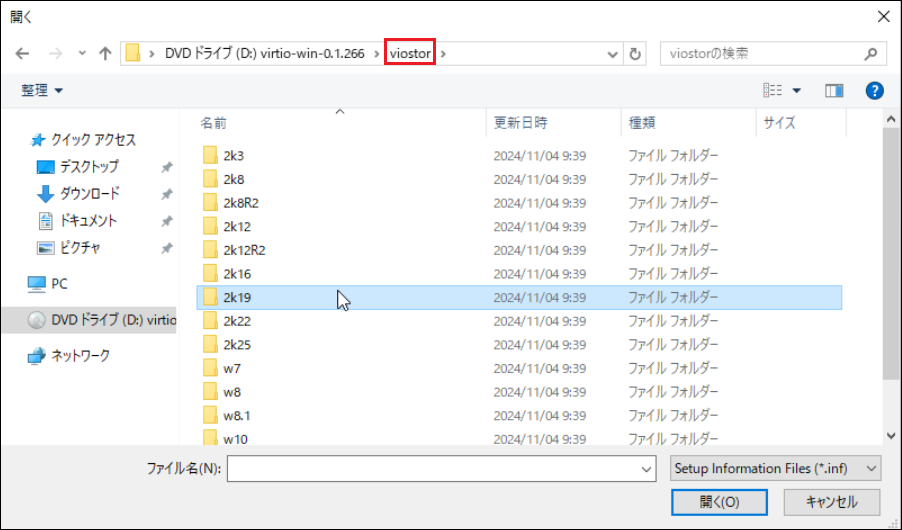 (下記画像では、例としてWindows Server 2019を使用しているため、「2k19」フォルダー内にある「viostor.inf」を選択します)