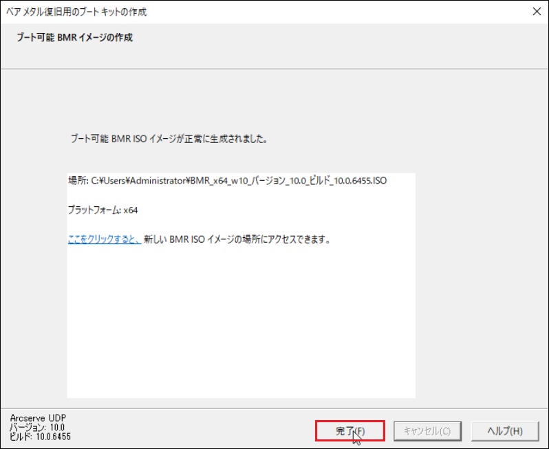 23.「ブート可能 BMR イメージの作成」画面にて、BMR ISOイメージの作成が完了すると以下の画面が表示されます。