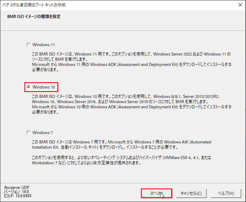 2.「BMR ISO イメージの種類を指定」画面で、該当するものを選択し、[次へ]をクリックします。
