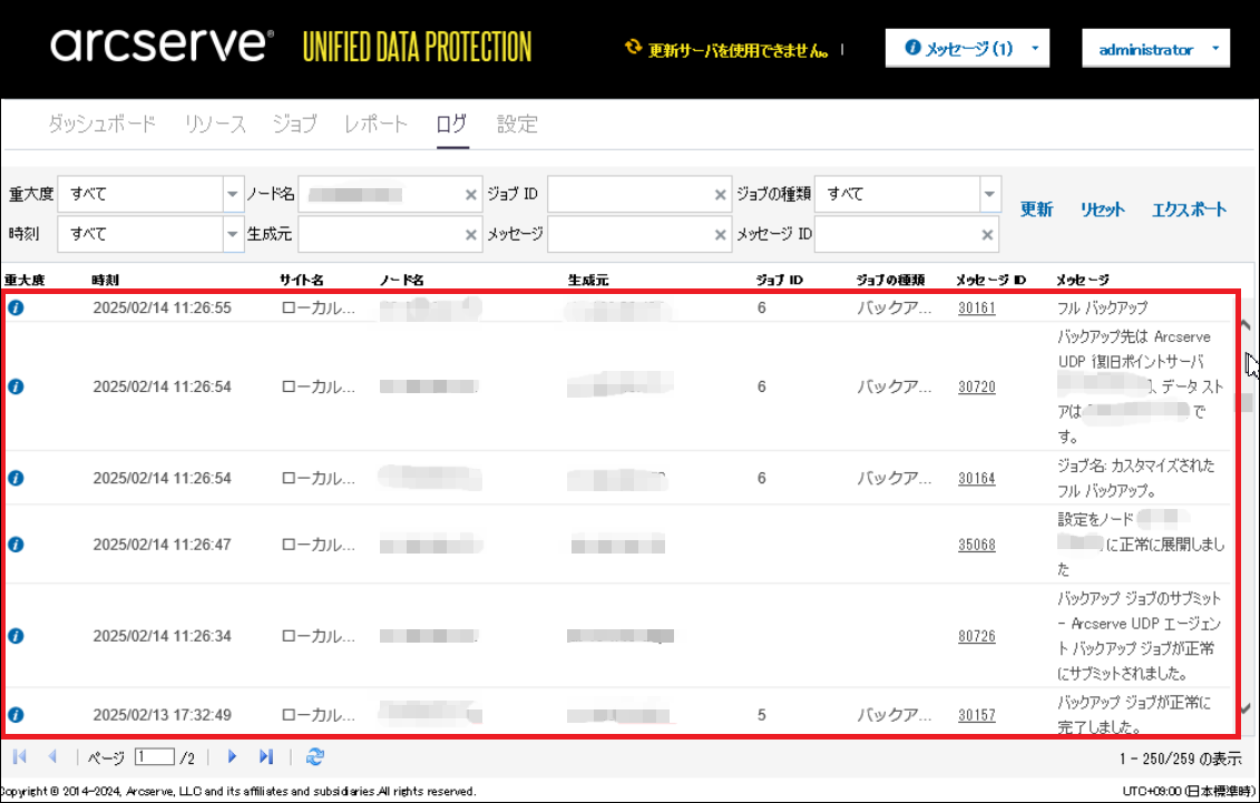 3.Arcserve UDPコンソール画面で、[ログ]をクリックし、メッセージに現在のArcserveのバージョンが表示されていること、過去のログが表示されているかを確認します。