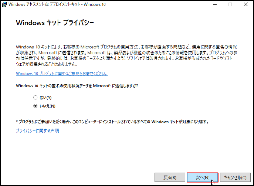 7.「Windows キット プライバシー」画面にて必要に応じ、[はい]または[いいえ]を選択し、[次へ]をクリックします。
