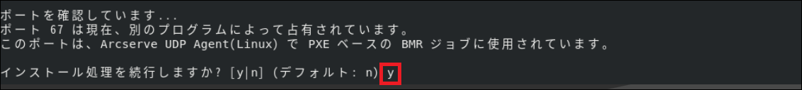 Red Hat Enterprise Linux(以降RHEL)7および8 環境では依存関係の確認で"67"ポートが占有され、上記の表示となる場合があります。これは"dnsmasq"プロセスがデフォルトで67ポートを使用していることが原因で表示されますが、この例によるバックアップでは、PXEベースのBMRを使用しないのでバックアップ運用に影響しません。