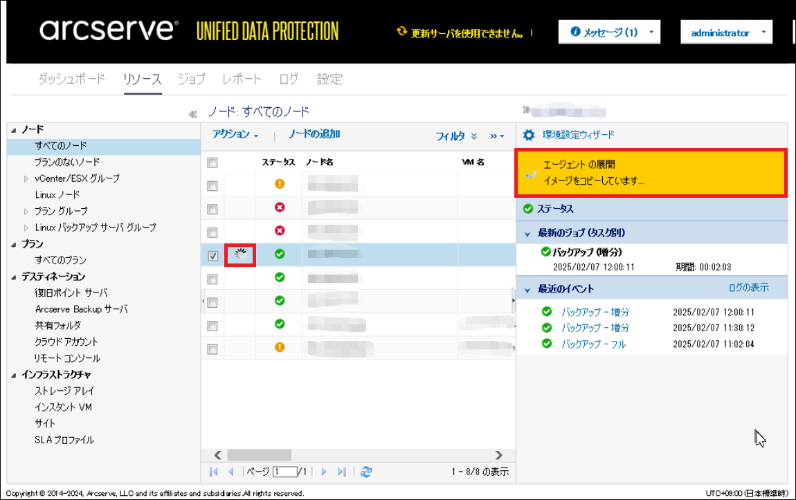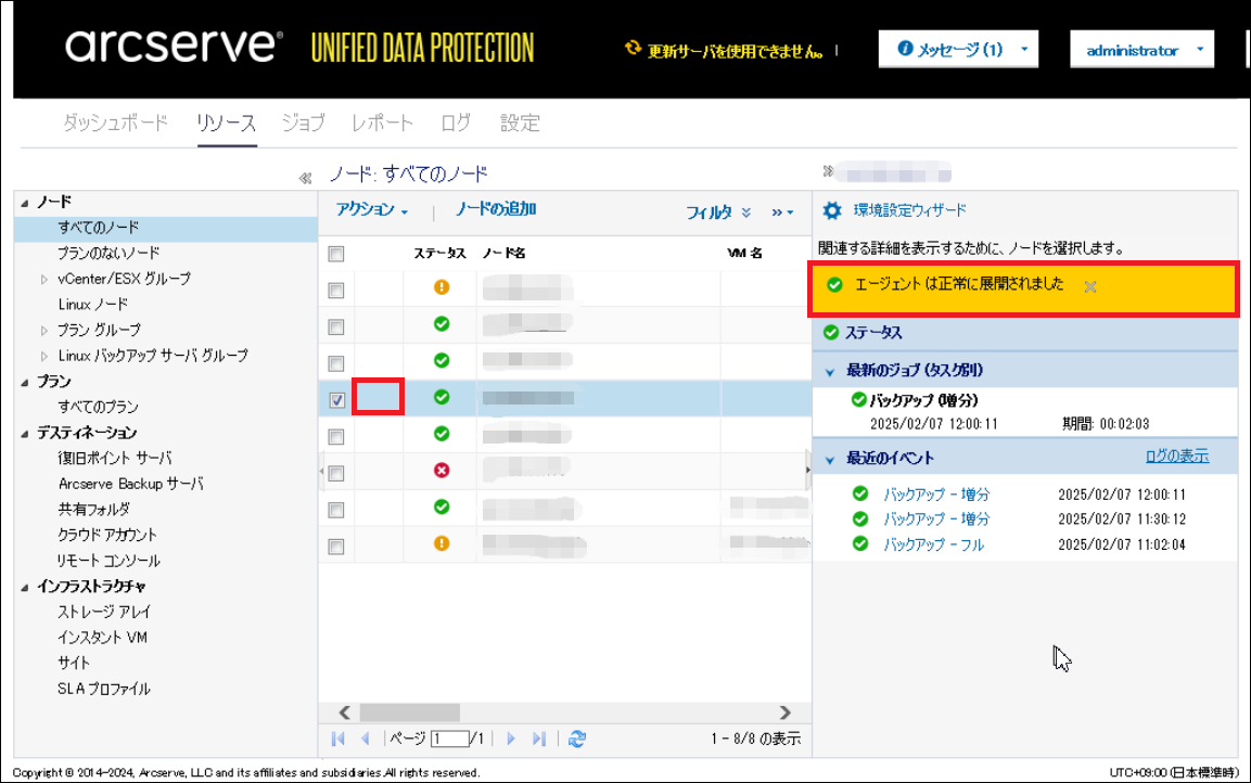 4.「Arcserve Unified Data Protection - エージェント」のステータスが「アップグレード」となっていることを確認します。