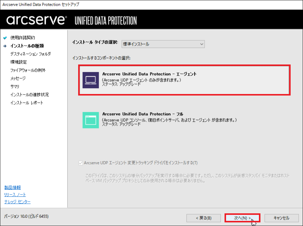 [Arcserve Unified Data Protection - エージェント]が選択されていることを確認し、[次へ]をクリックします。