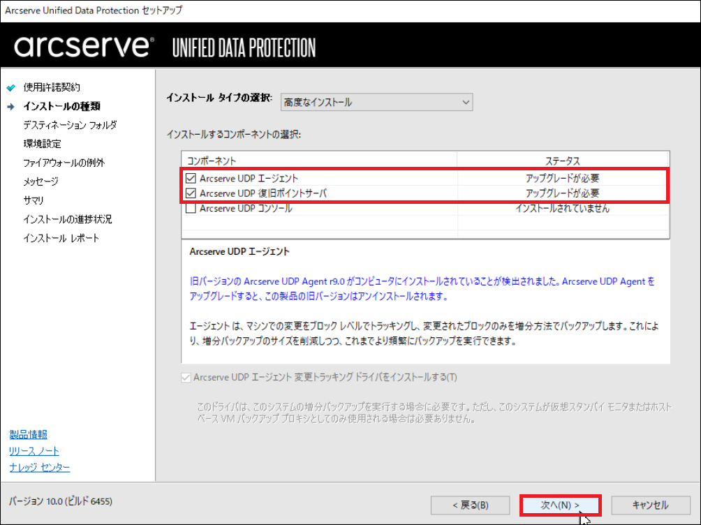 [Arcserve UDP エージェント]、[Arcserve UDP 復旧ポイントサーバ]が選択されていることを確認し、[次へ]をクリックします。