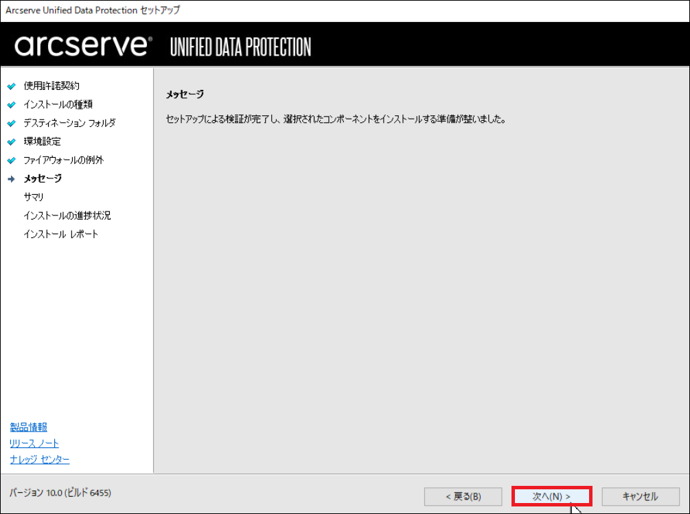 8.セットアップの検証が完了し、インストールの準備が整うと、以下の画面が表示されます。