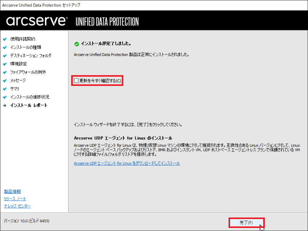 11.インストールが完了したら、[更新を今すぐ確認する]のチェックを外し、[完了]をクリックします。